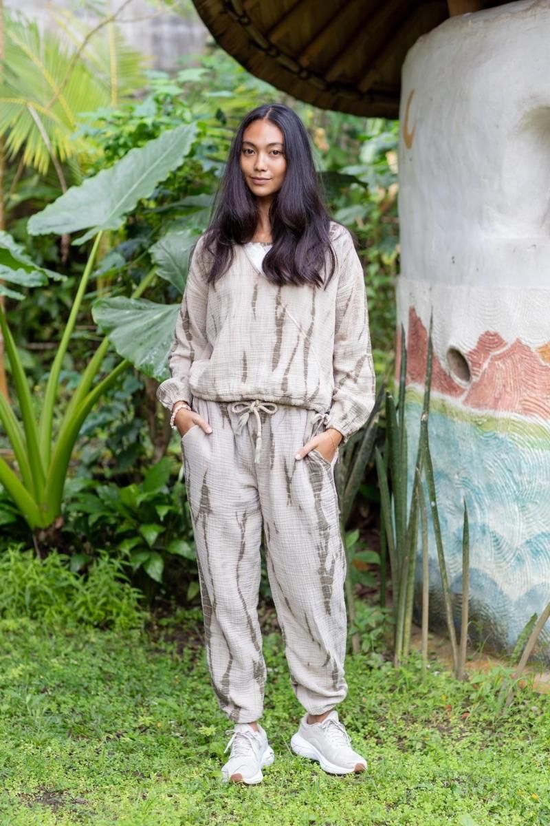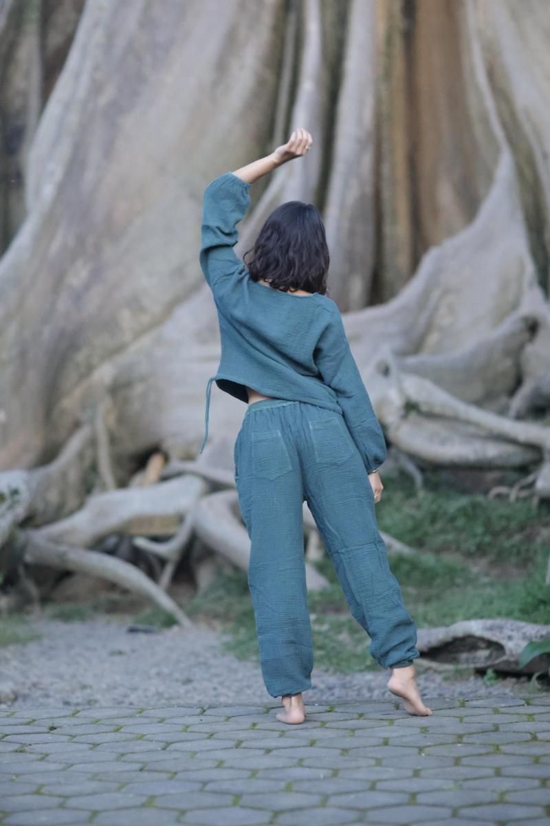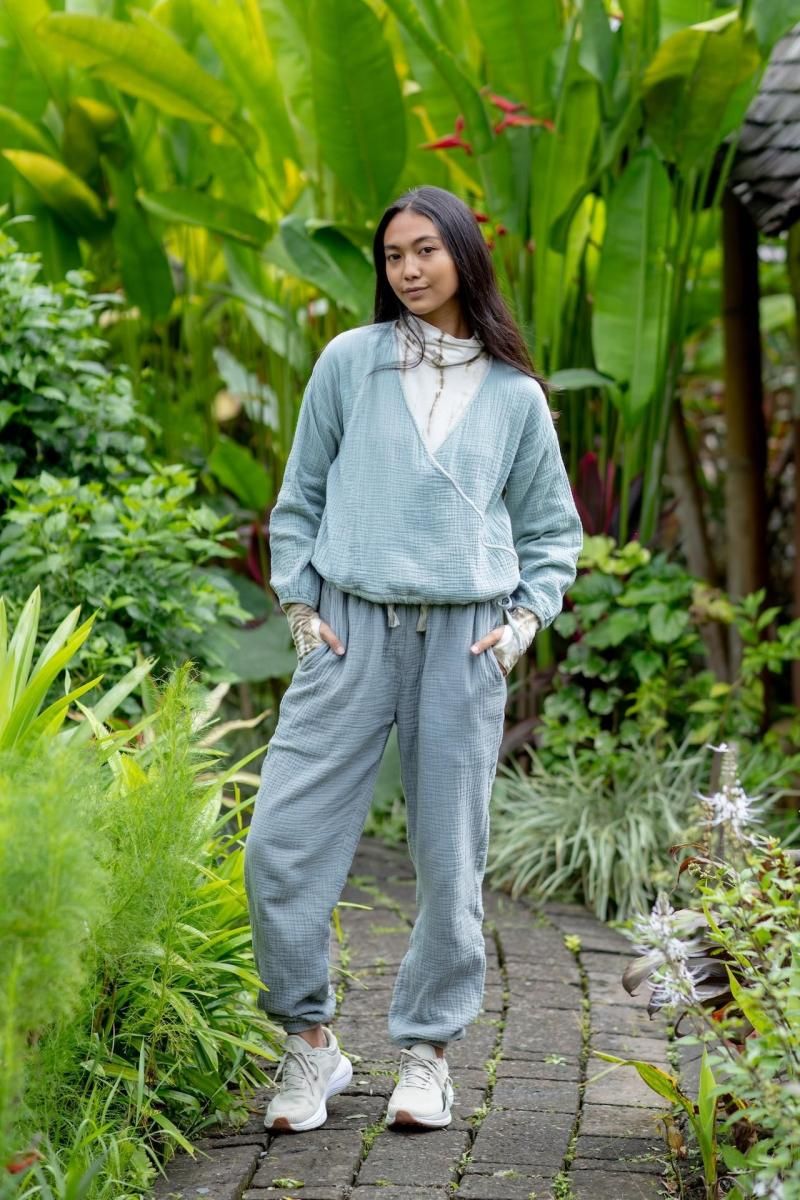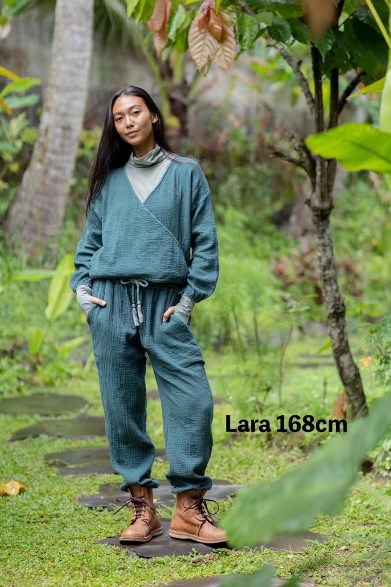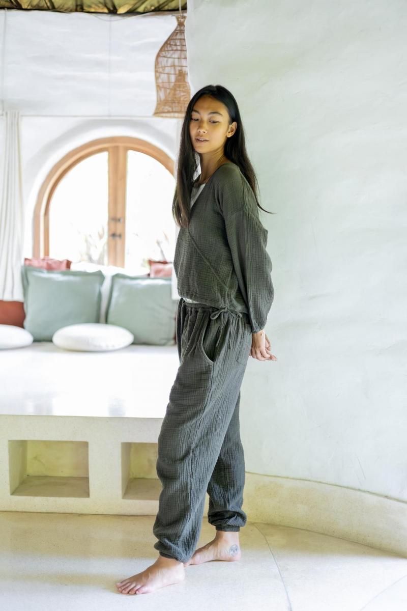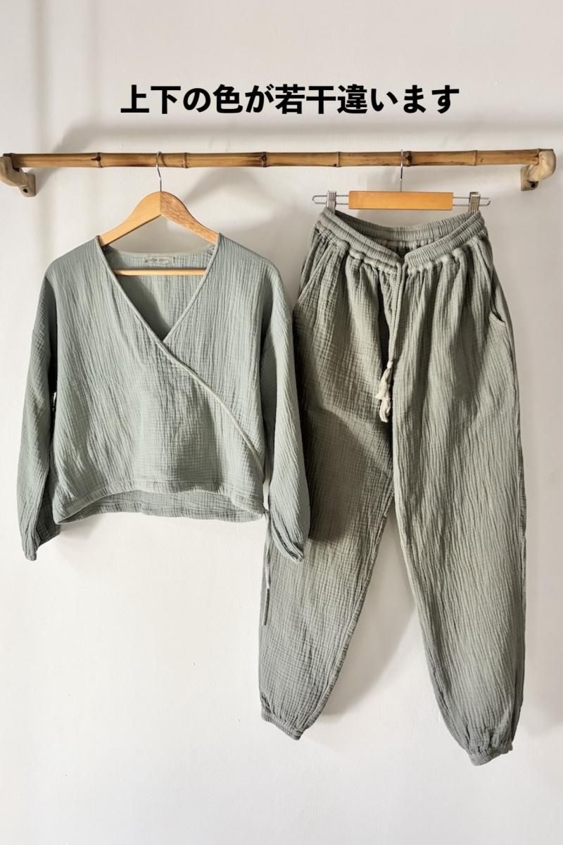 トップスのWガーゼカシュクールよりも厚いガーゼで下半身ぽかぽかです。