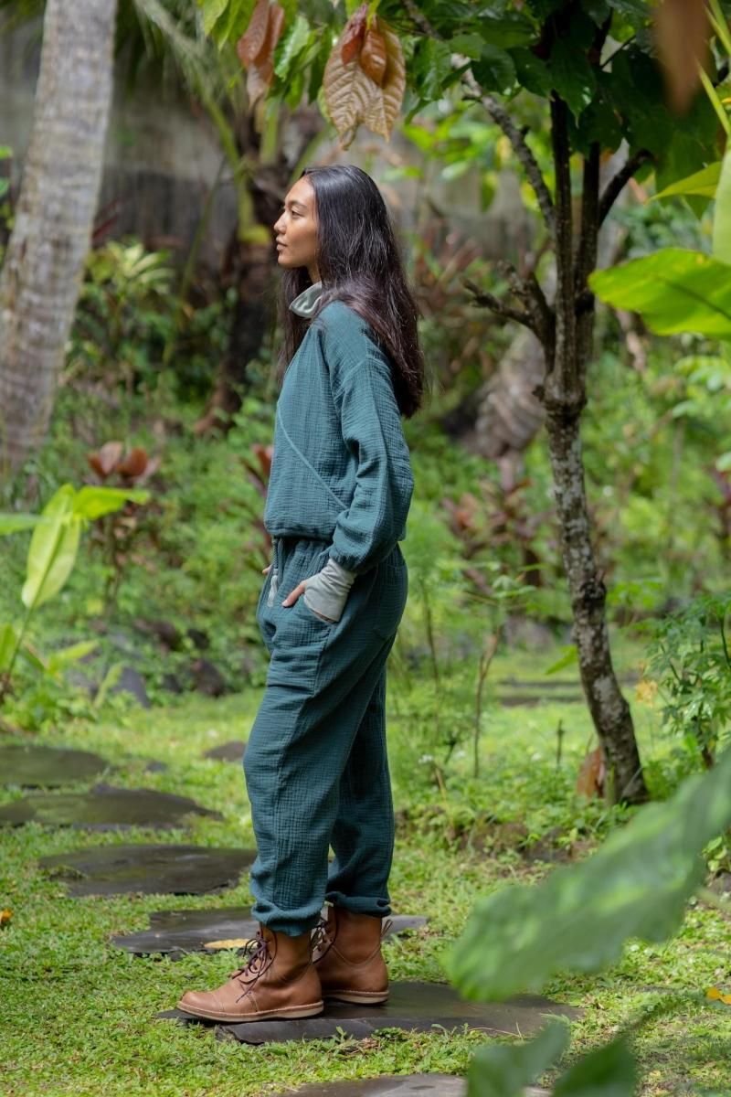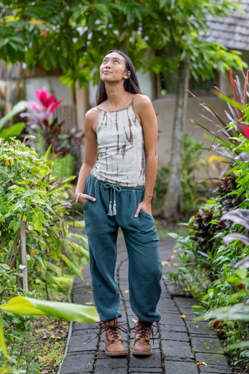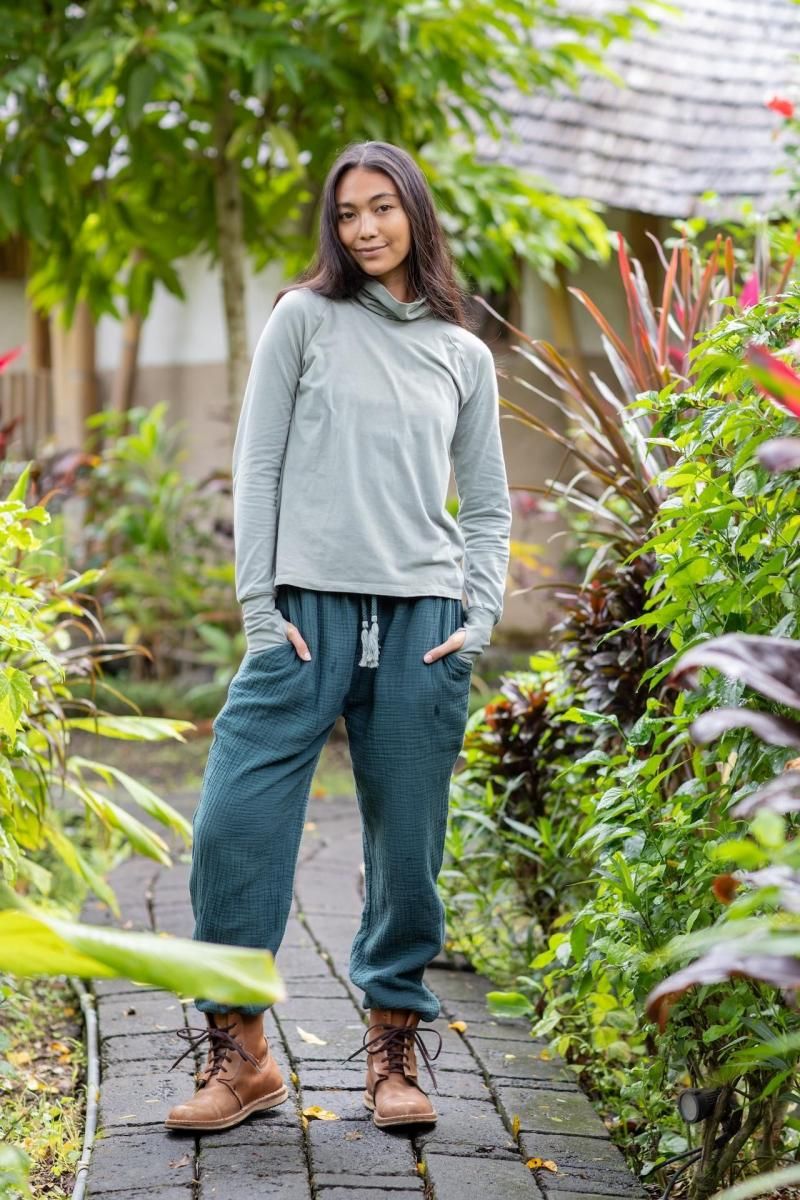 ウエストのタッセル紐は、ラフに垂らしても、ゆるいときには軽く結んでも。足首はゴム仕様なので、小柄な方にも自然に馴染みます。