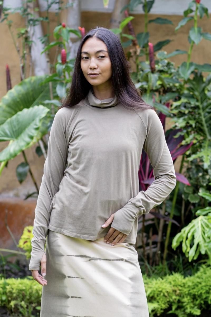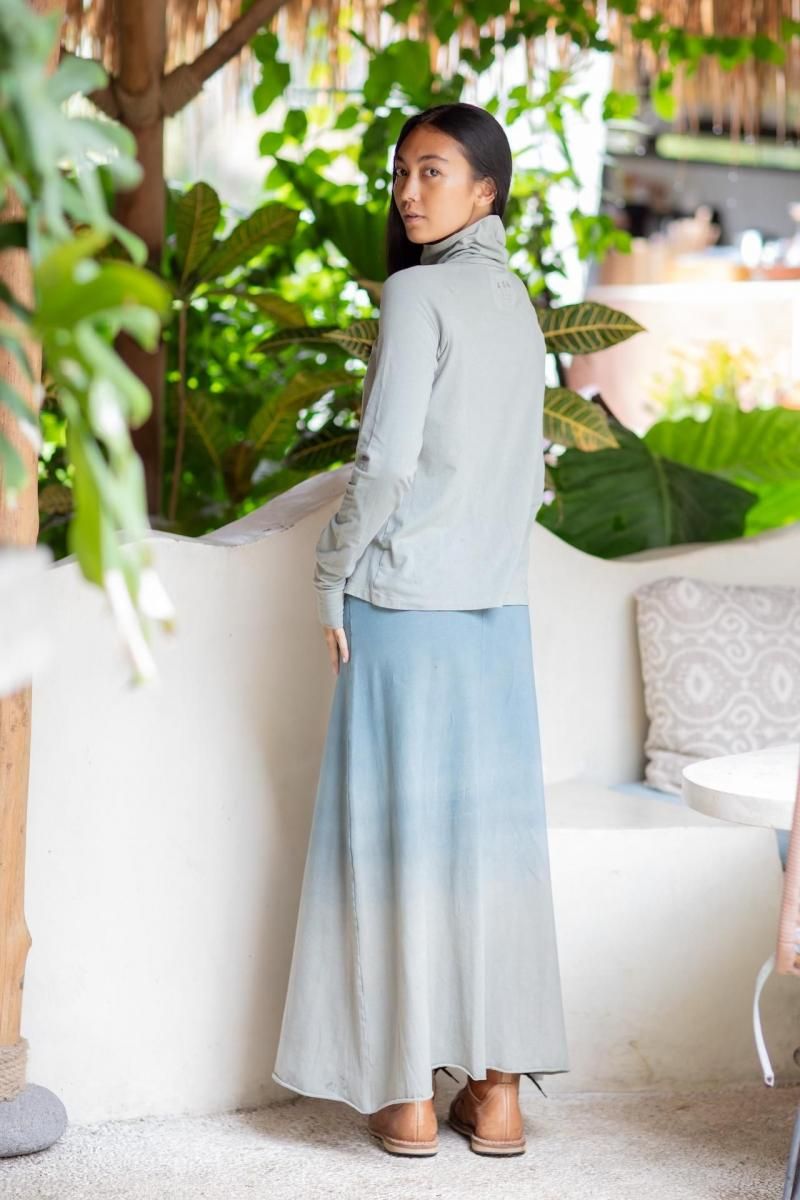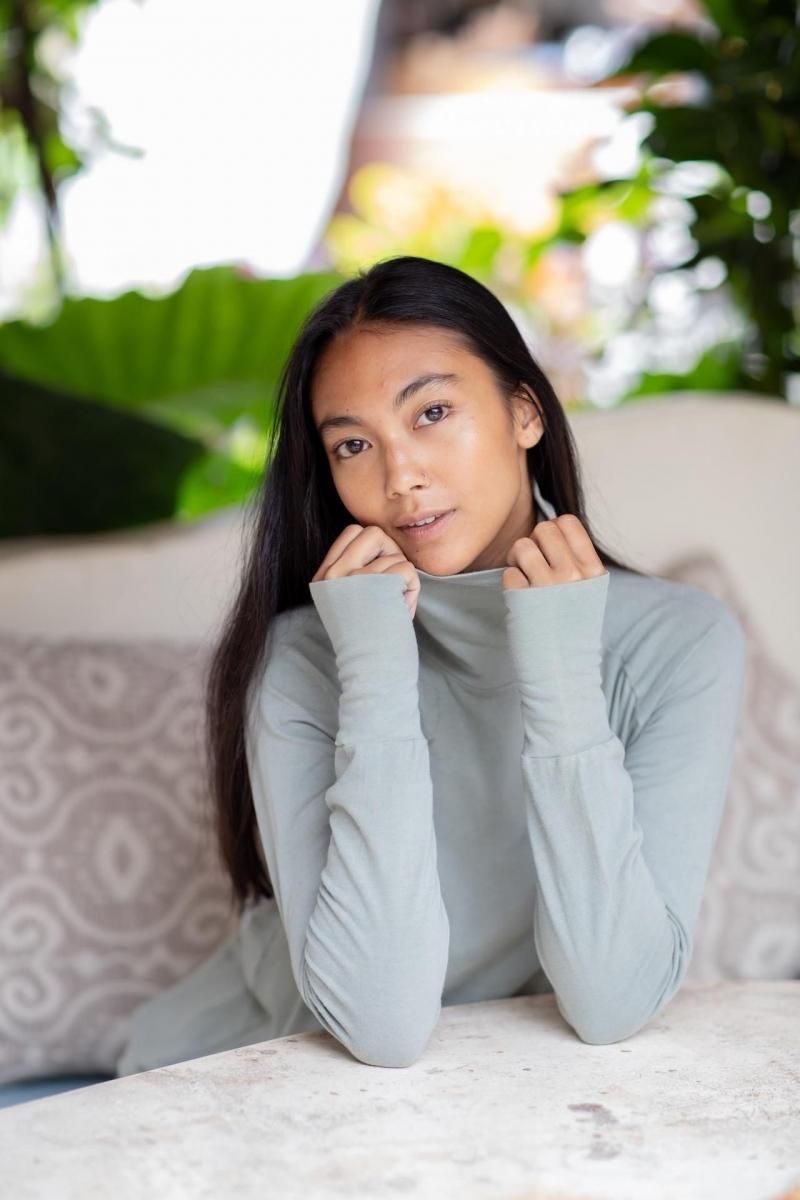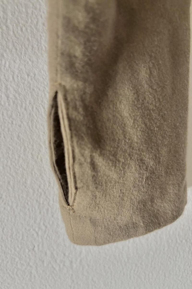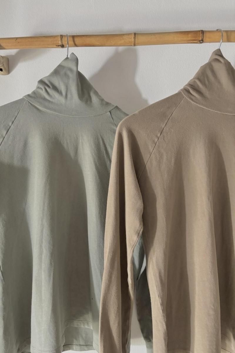 伸縮性ありのオーガニックコットン素材タートルネック&サムホール(袖長で親指用の穴付き)仕様で、上半身を完璧にカバーするロングスリーブカットソーです。