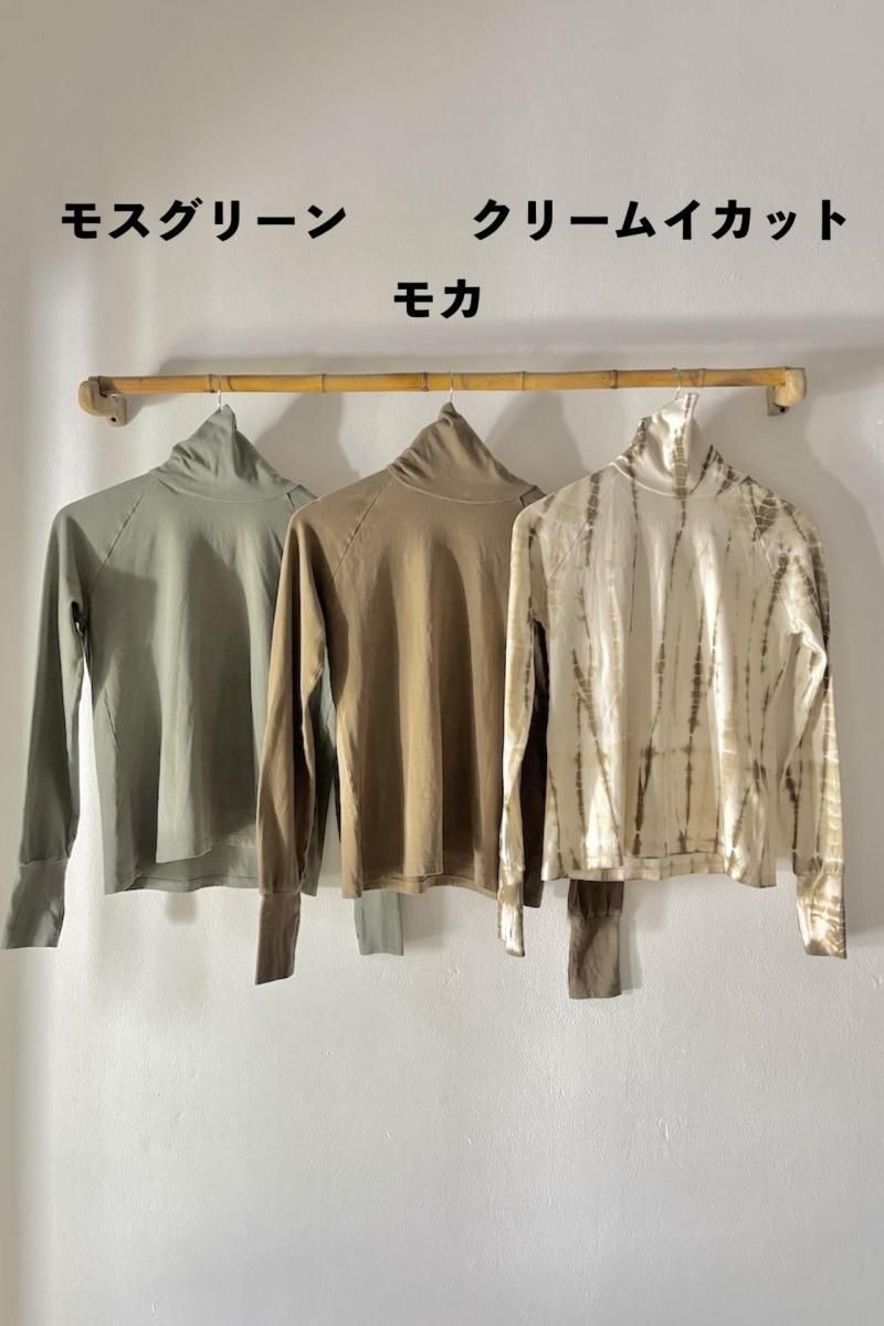 オーガニックコットンタートルネック モスグリーン/モカ/クリームイカット